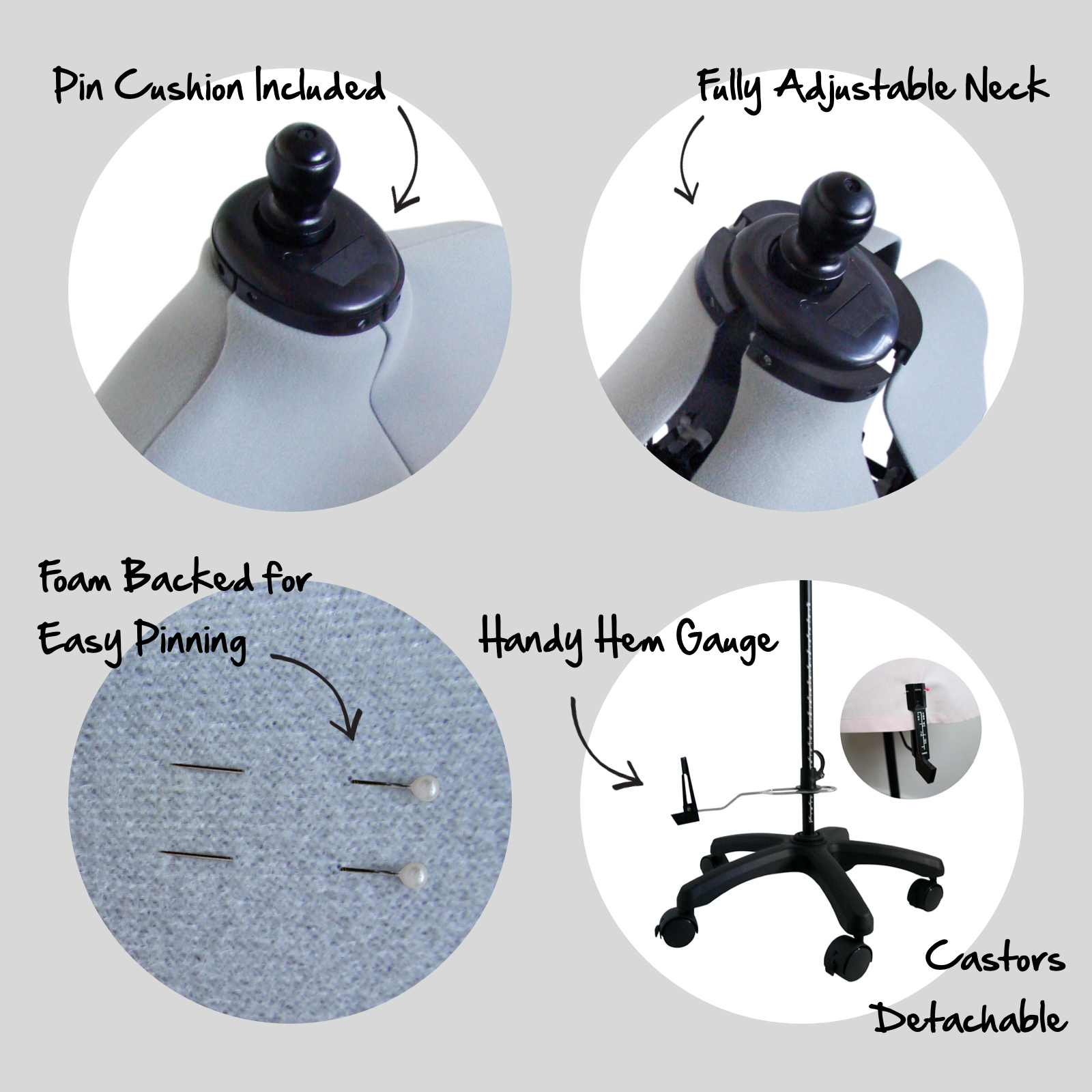 "I love my new dressmaking dummy. It is very light weight with a heavy base, comes with optional castors if you want it on wheels, and the included hem marker makes it easy to neaten a hem.
