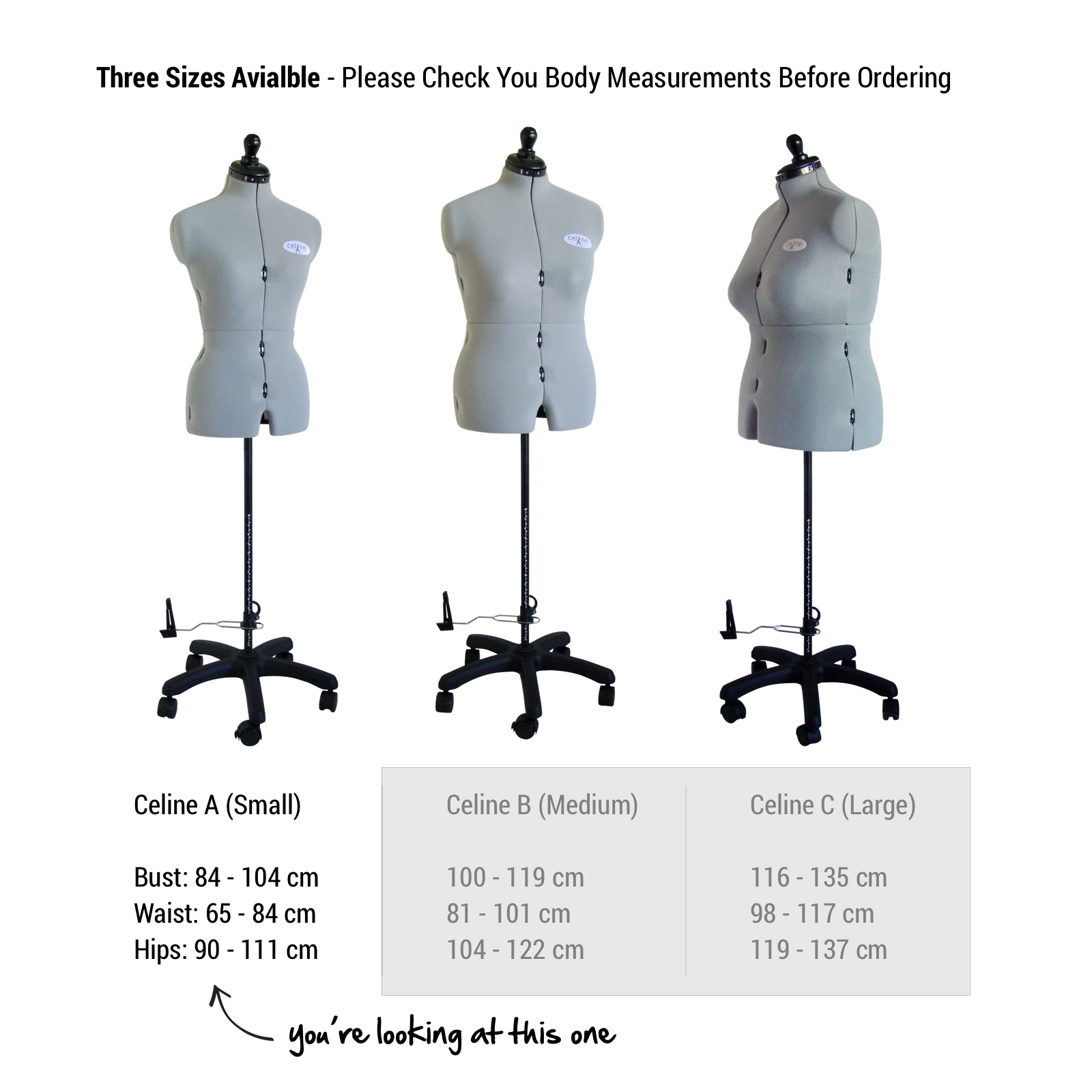 The main difference is in the adjustors (which is the wheels that makes them go larger or smaller). The dressmaker's dummies in the Celine range are lighter and measurments are not marked on them.