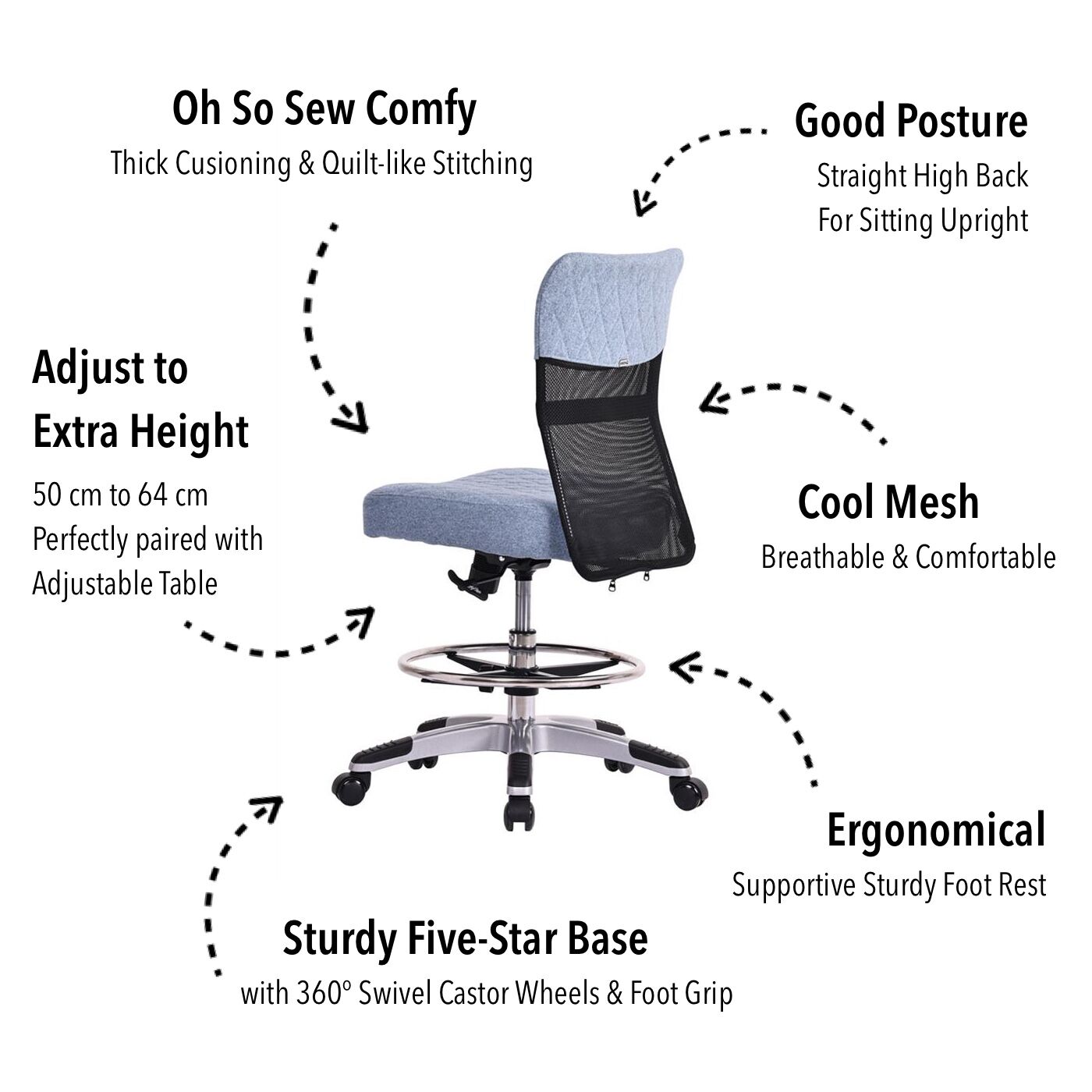 For better ergonomics, adjust the seat height to a perfect match for your sewing machine cabinet, drafting table, or standing desk (e.g. FlexiSpot adjustable height sewing table), while the sturdy 5-prong base with heavy-duty castor wheels ensures effortless movement wherever inspiration takes you.