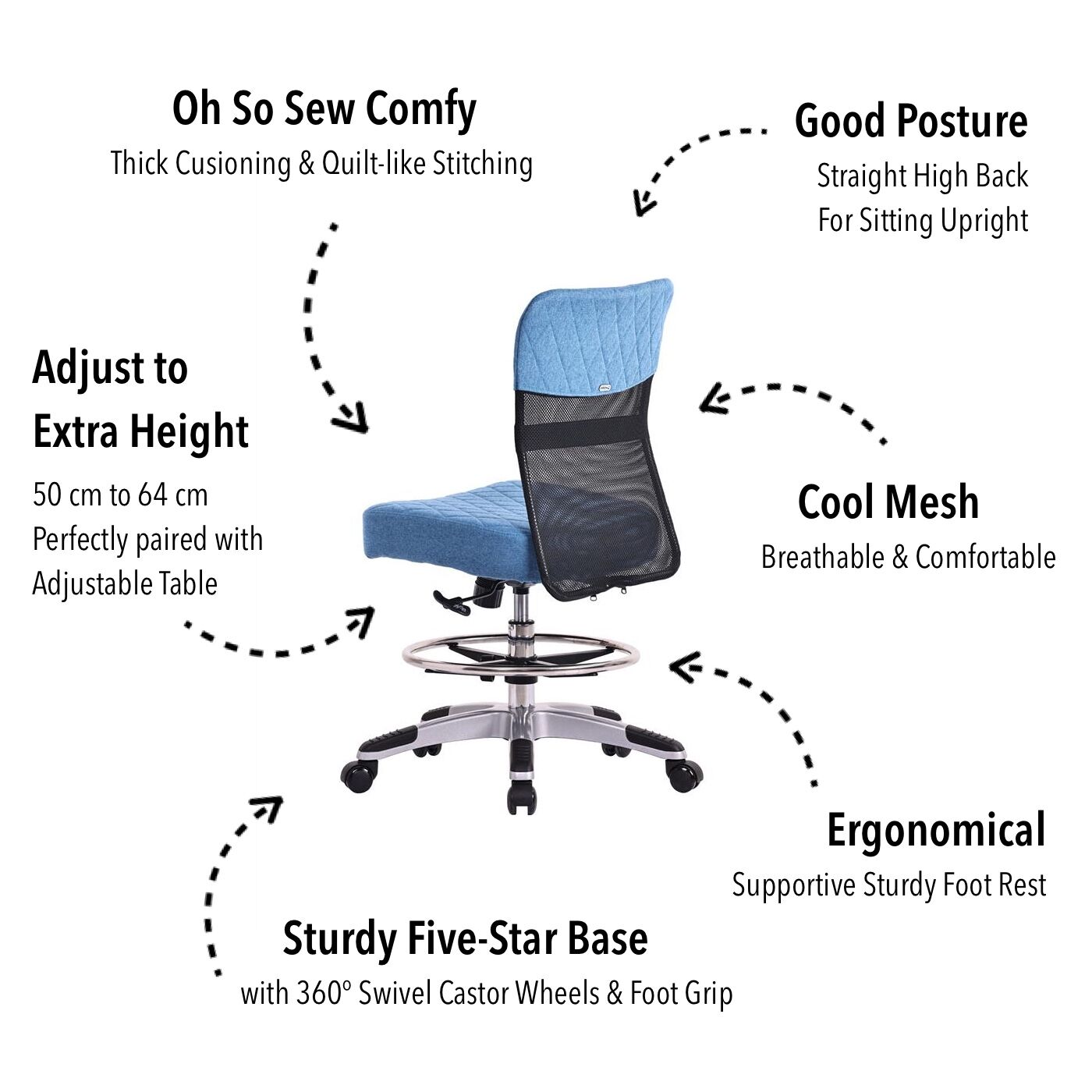 For better ergonomics, adjust the seat height to a perfect match for your sewing machine cabinet, drafting table, or standing desk (e.g. FlexiSpot adjustable height sewing table), while the sturdy 5-prong base with heavy-duty castor wheels ensures effortless movement wherever inspiration takes you.