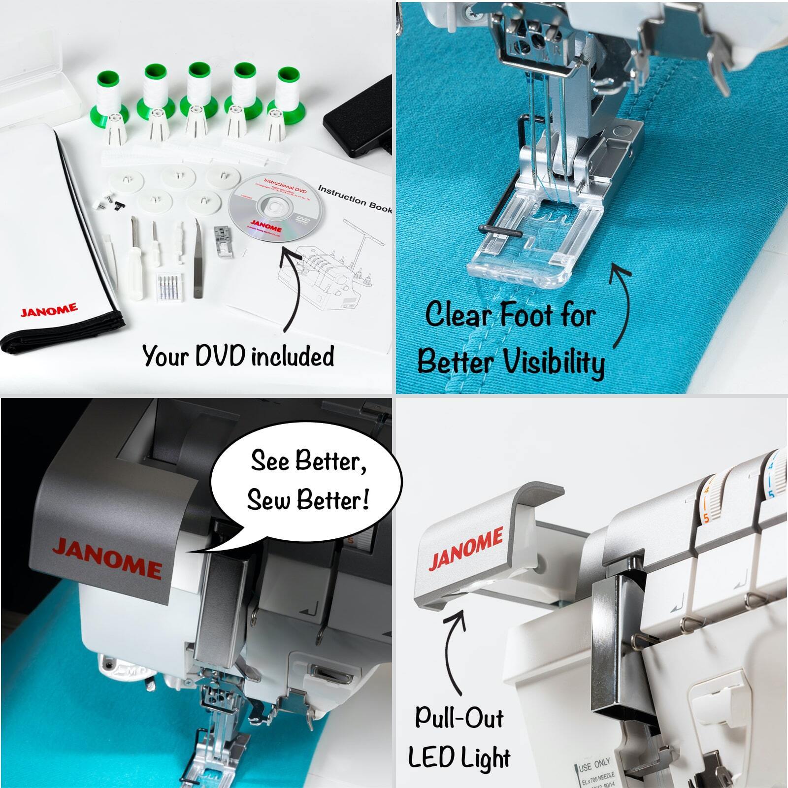 - Bright LED lighting illuminates the workspace from 3 locations, one being our innovative retractable sewing light, positioned top left on the machine, above the needle area.