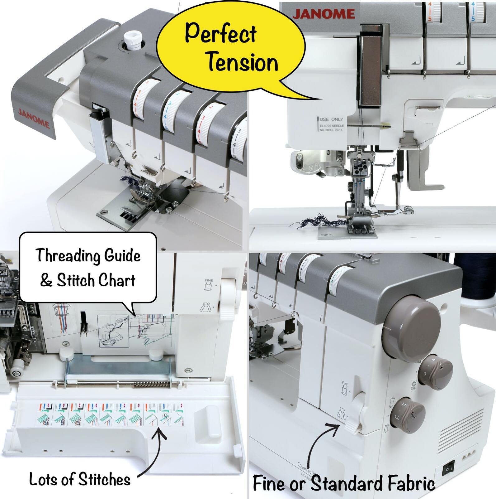 - Fine Mode switch for stitching from lightweight fine knits to standard fabrics- for perfect tension
