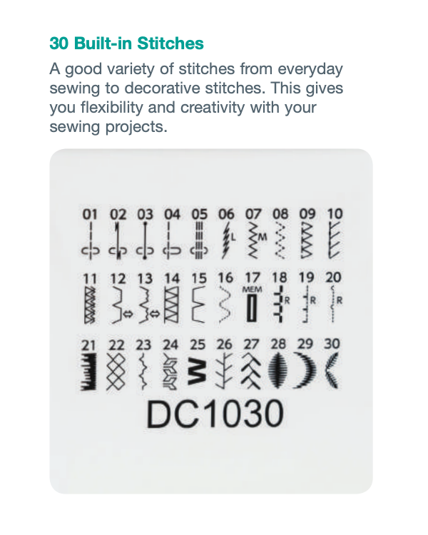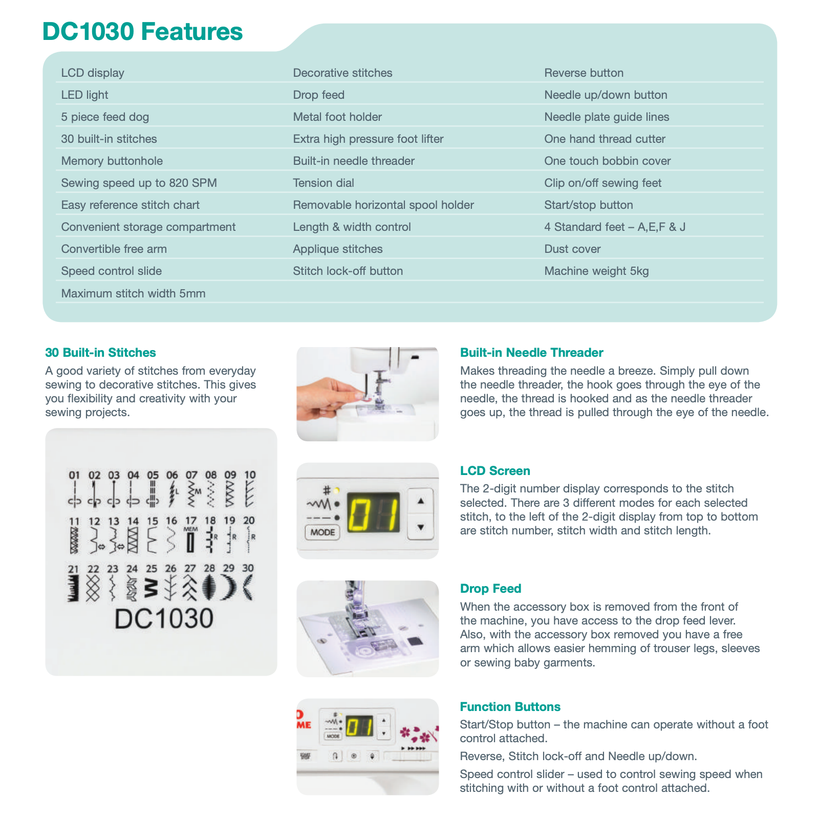 - An Entry-Level Computerised model, your new DC1030 is capable of gives you 30 built-in stitches including 1 memory buttonhole.