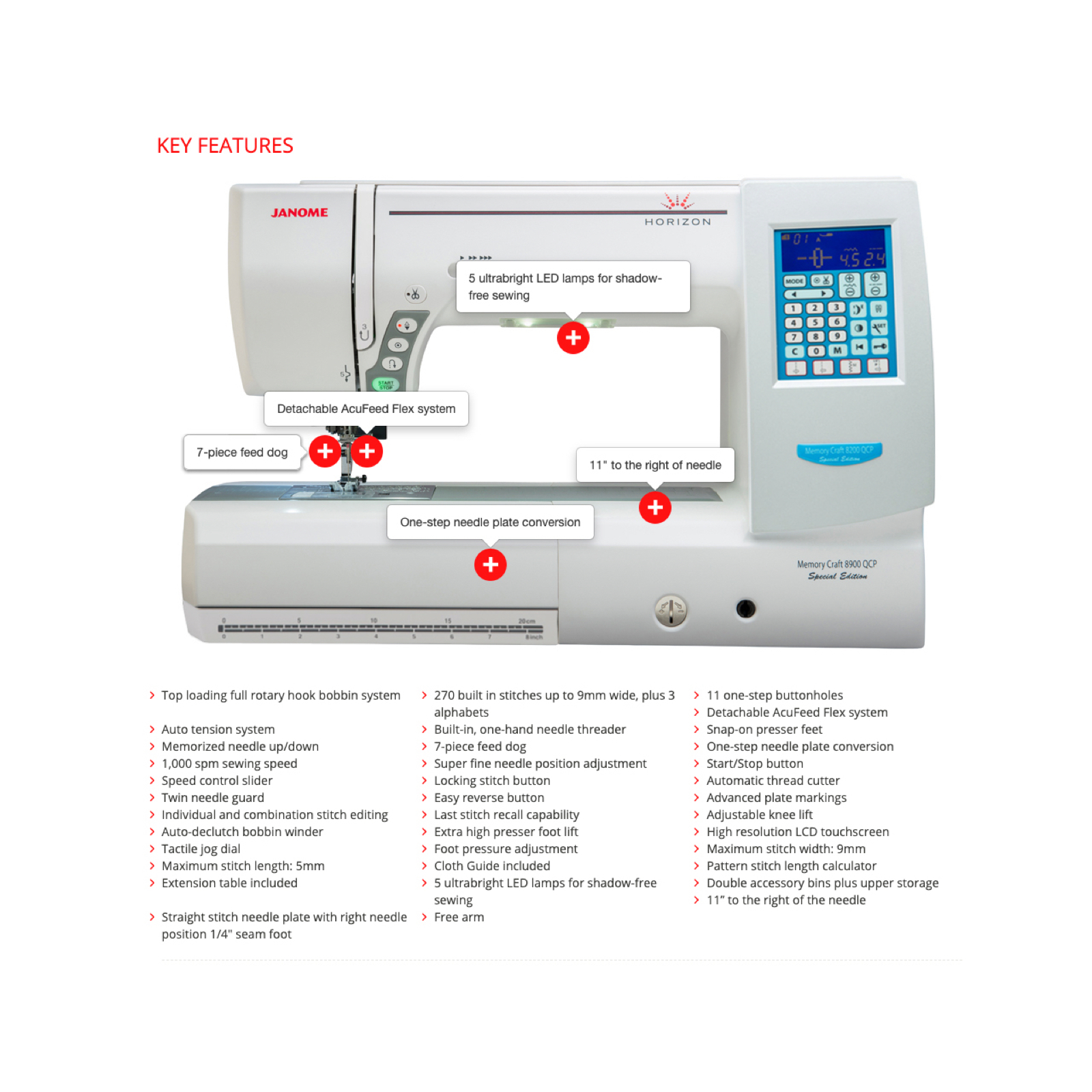 Your new Janome Horizon Memory Craft 8200QCP (MC8200QCP for short) will provide a reliable sewing experience at your finger tips..... so you can concentrate on growing your business.