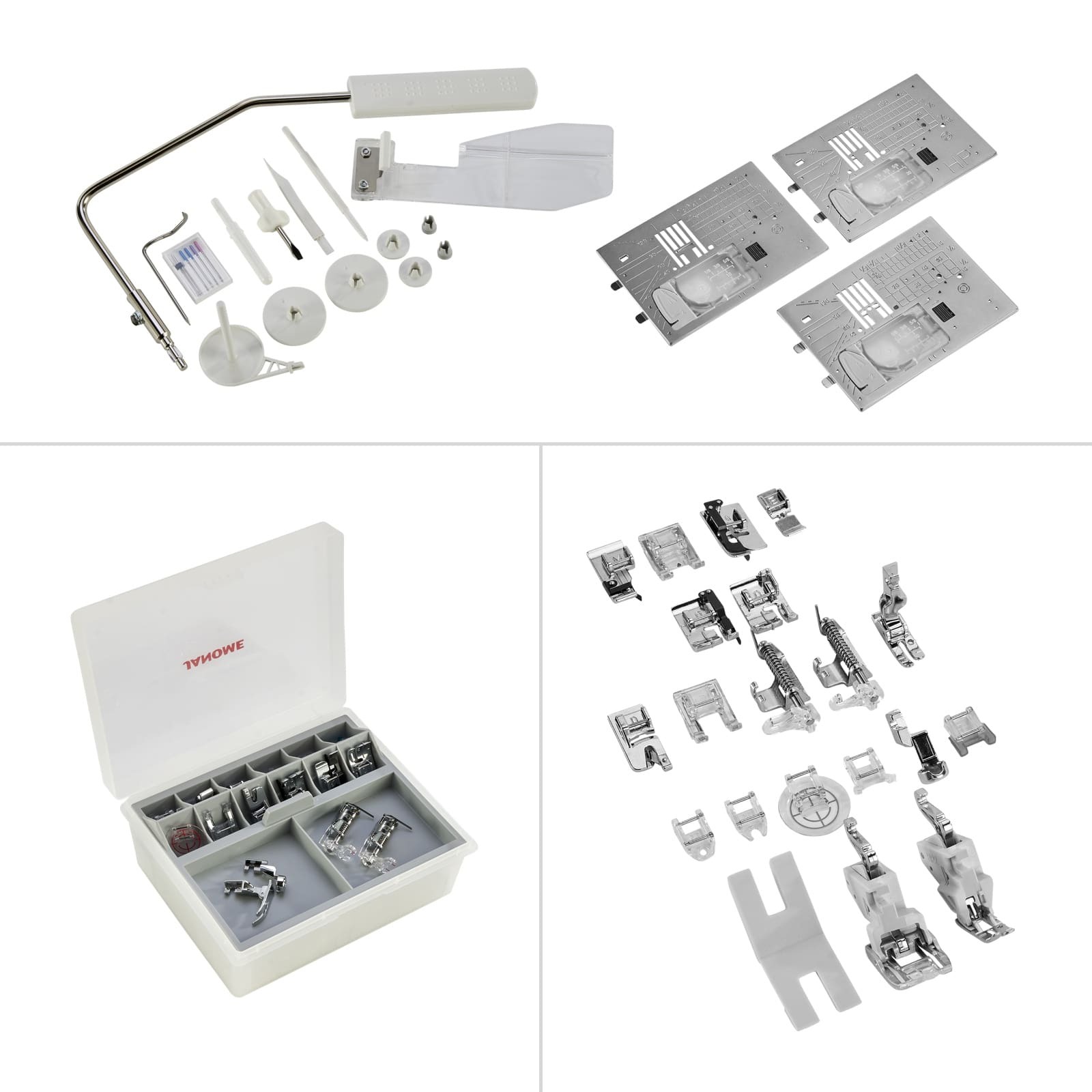 - Easy Change Needle Plates x 3 for precision sewing with needle drop position, angle marks and sewing guides in front of the sewing foot.