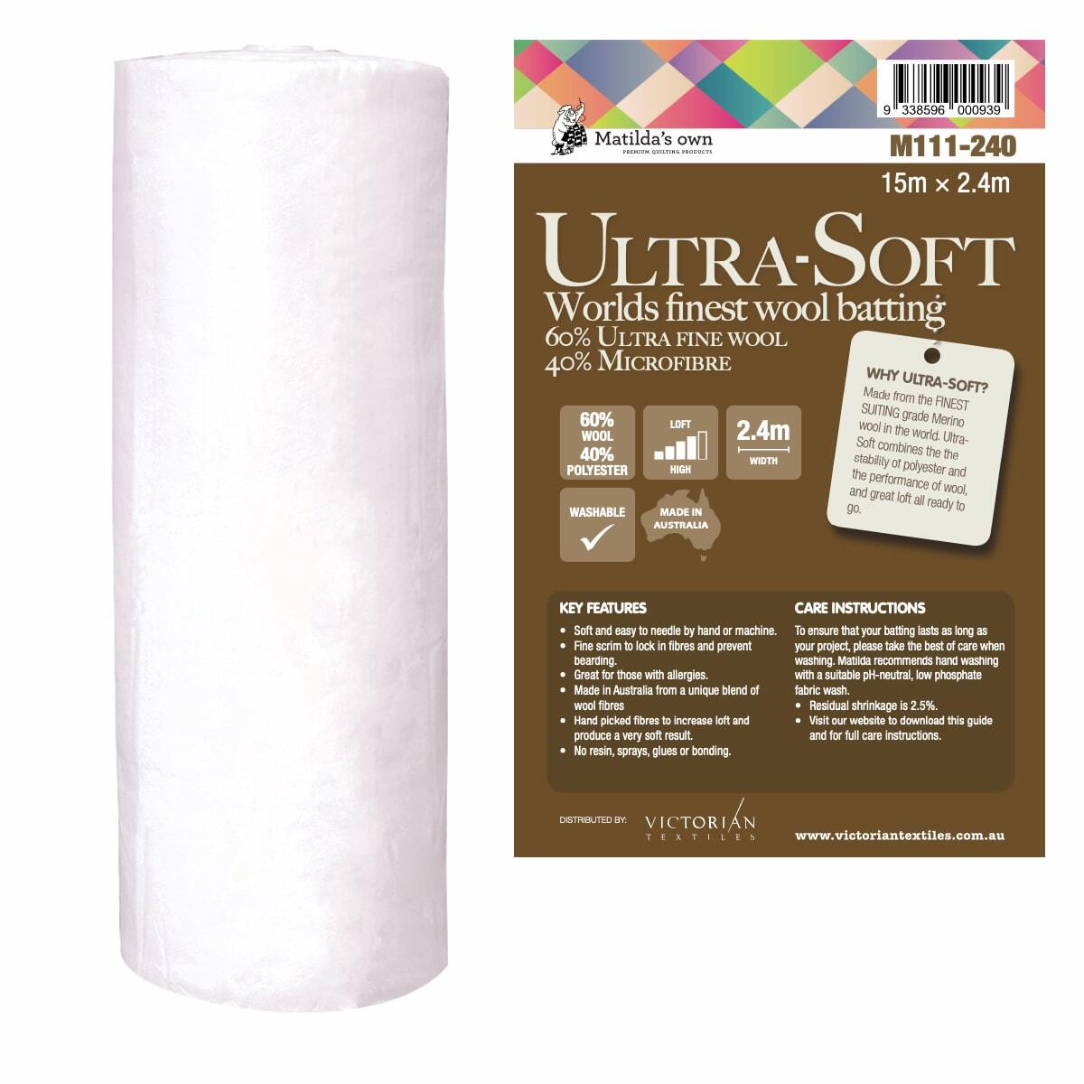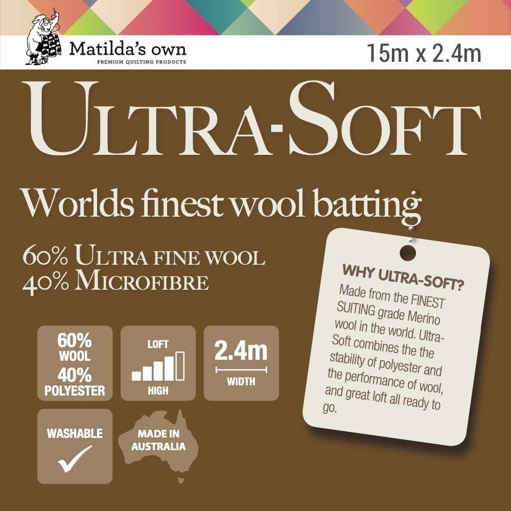 Matilda's UltraSoft is the world's finest wool batting, combining Suiting-Grade Wool and the stability of Microfibre, this is THE highest loft that Matilda makes, yet the cloud-like softness makes it easy to quilt - by hand or by machine.