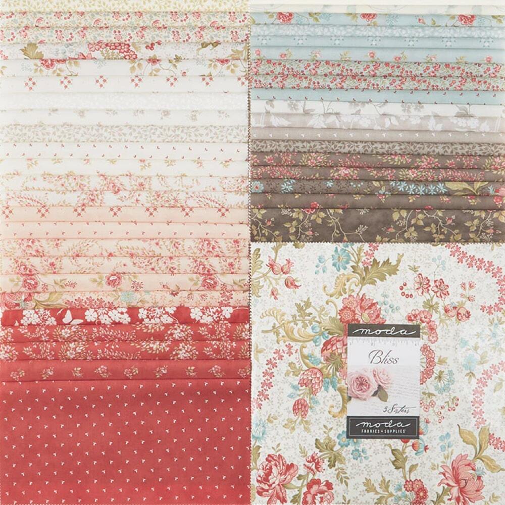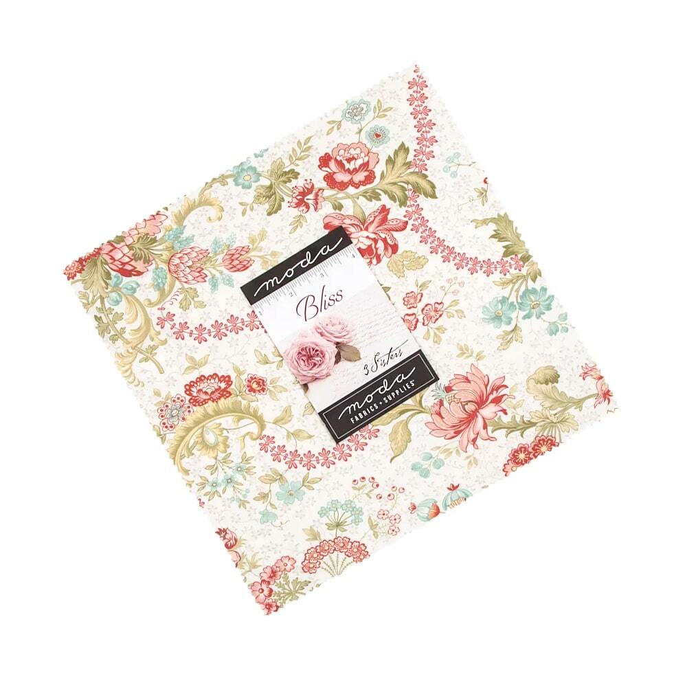 Moda "Bliss" by 3 Sisters Layer Cake is a convenient pre-cut assortments of colour-coordinated fabric squares in 100% cotton for patchwork quilting. Designed by Designed by Three Sisters, and professionally cut and packaged by Moda Fabric, this pack contains 42 of 10" x 10" (or 25.4 cm x 25.4 cm) fabric squares - which are quite large and ideal to show off the design fully. Feel graceful while working with this collection by 3 Sisters. Bliss is a beautiful selection of delicate designs featuring elegant florals combined with delightful hues. In the classic shabby-chic style, enjoy small and medium floral prints that include butterflies, roses and an assortment of foliage and vines in rose, pink, aqua, cream and soft taupe. Oh! the utter joys of springtime!!