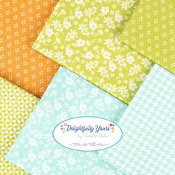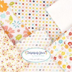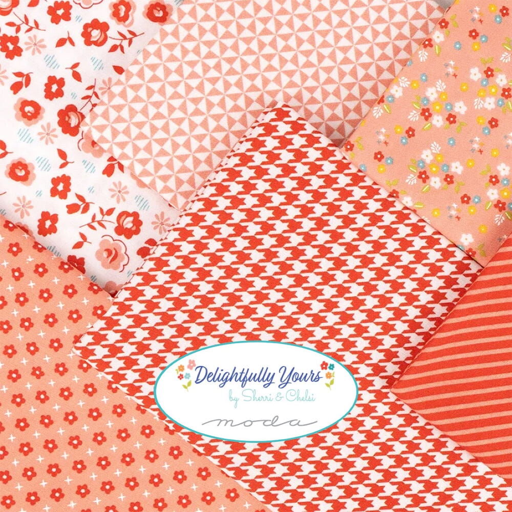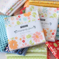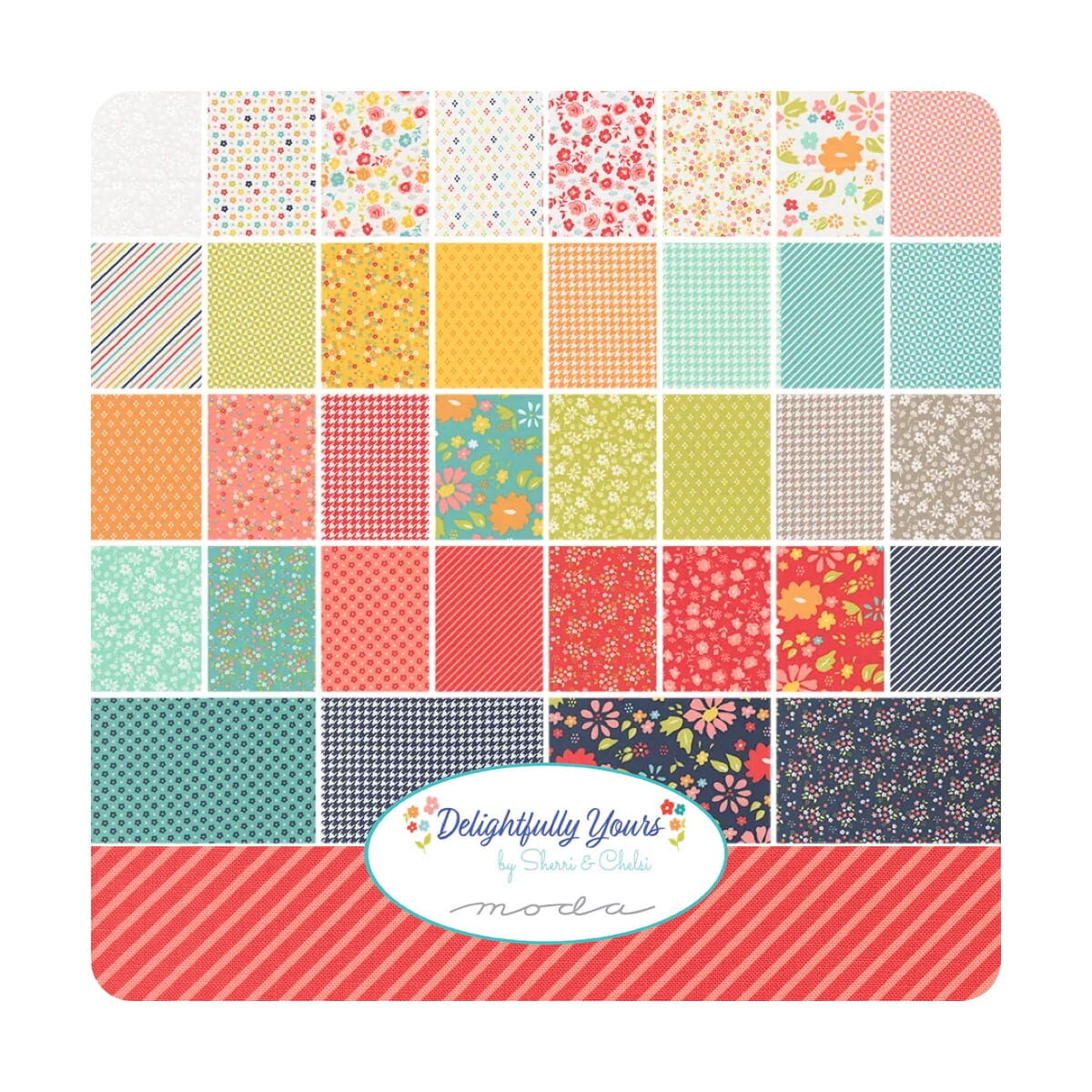 Moda "Delightfully Yours" Charm Pack is a convenient pre-cut assortments of colour-coordinated fabric squares in 100% cotton for patchwork quilting. Designed by Sherri and Chelsi, and professionally cut and packaged by Moda Fabric, this charm pack contains 42 of 5" x 5" (or 12.7 cm x 12.7 cm) fabric pieces - known as "Charm Squares".