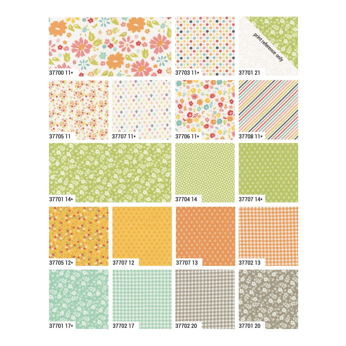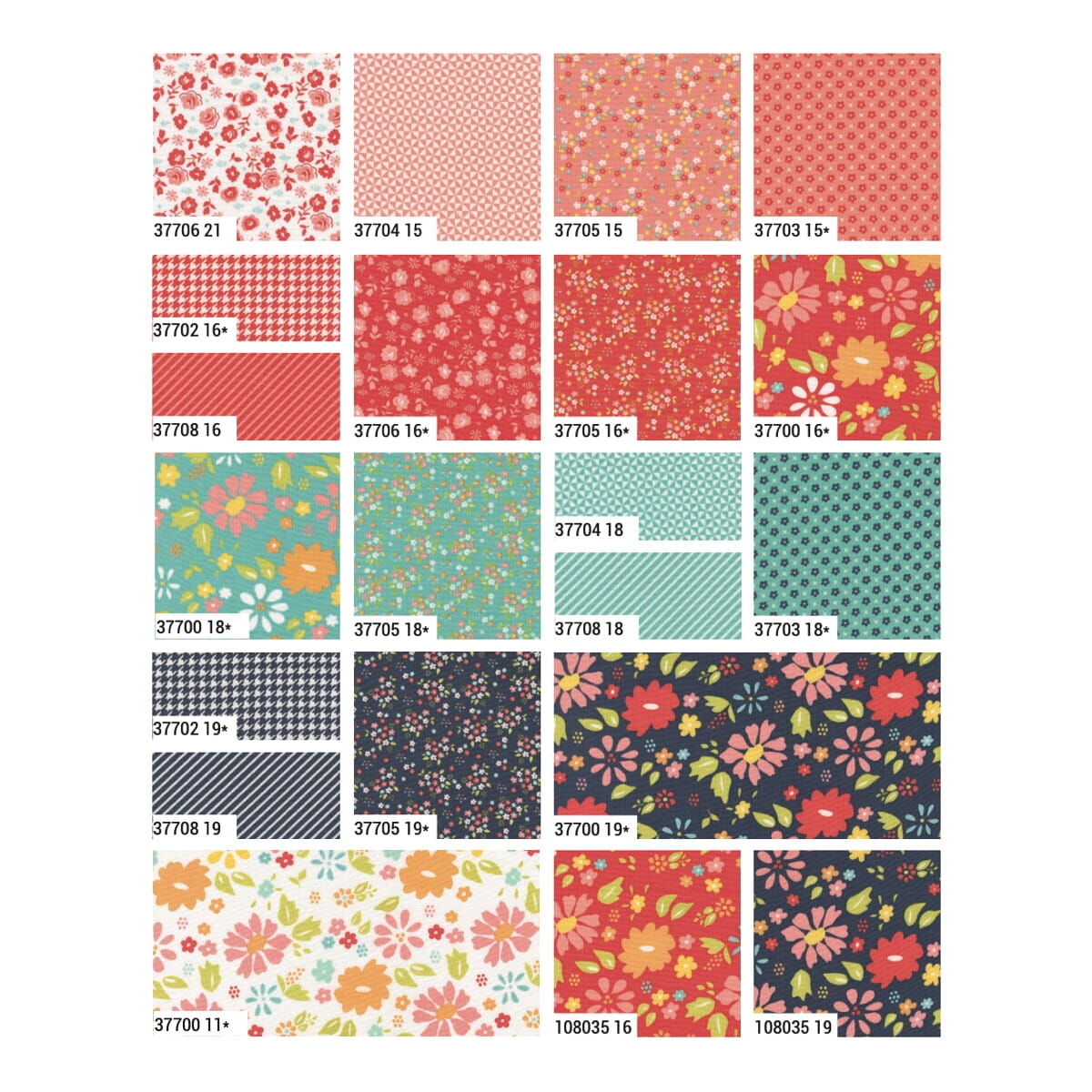 This blissful collection delights the senses with a palette of red, pink, green, orange, yellow, aqua, blue, grey and navy mixed with eight beautiful low-volume options. Prints include stripes, dots, pinwheels, and a tiny houndstooth print along with soft rainbow palette with sized-down geometric basics and Chelsi’s signature florals in a variety of sizes. Enjoy!