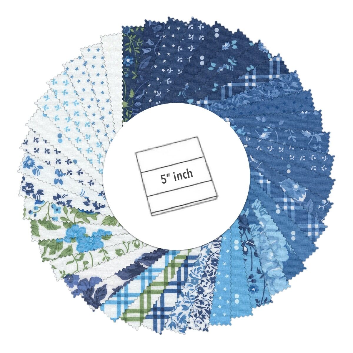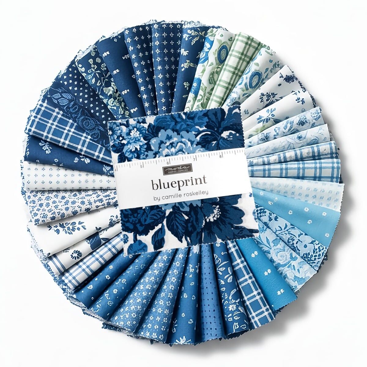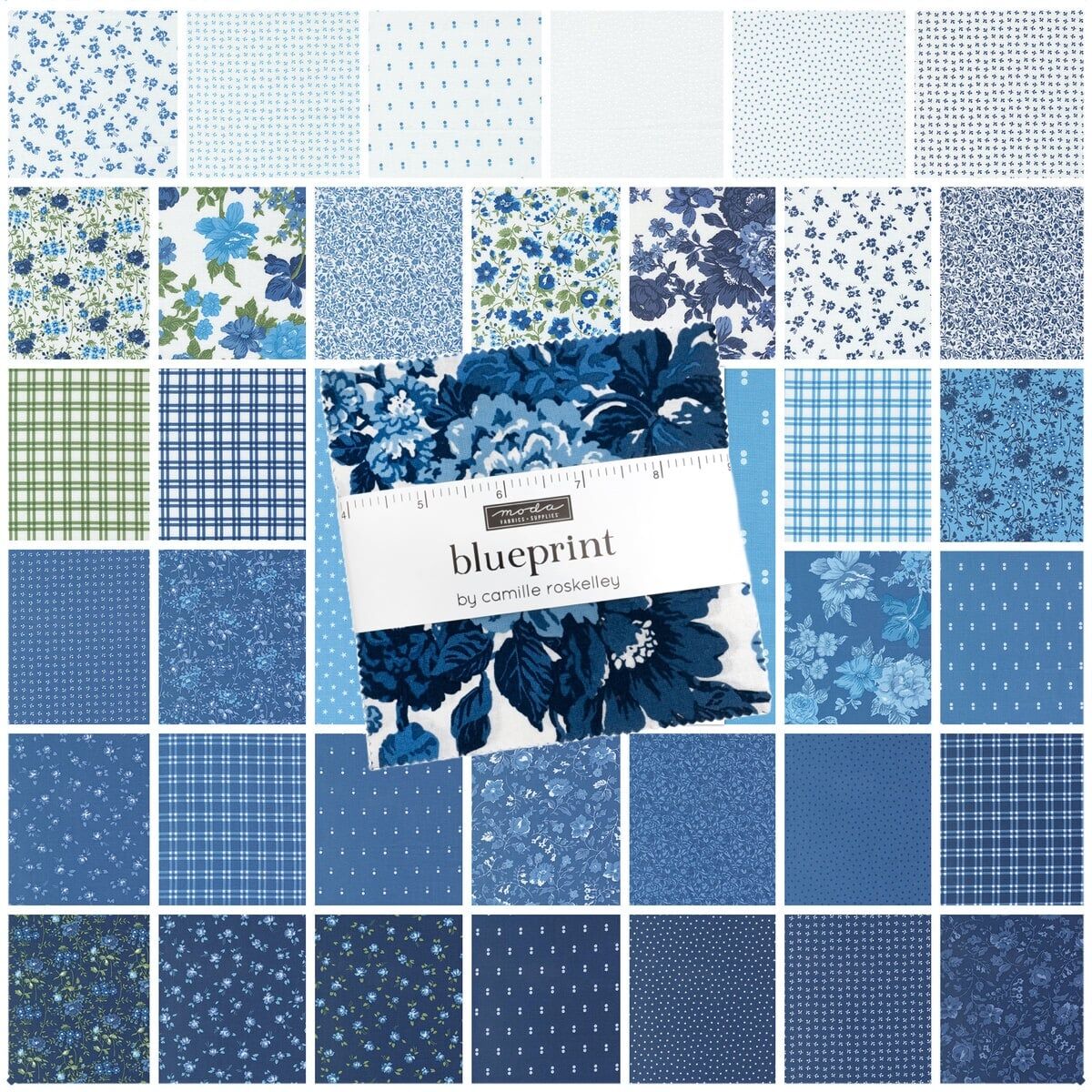Moda "Blueprint" Charm Pack is a convenient pre-cut assortments of colour-coordinated fabric squares in 100% cotton for patchwork quilting. Designed by Camille Roskelley, and professionally cut and packaged by Moda Fabric, this charm pack contains 42 of 5" x 5" (or 12.7 cm x 12.7 cm) fabric pieces - known as "Charm Squares".