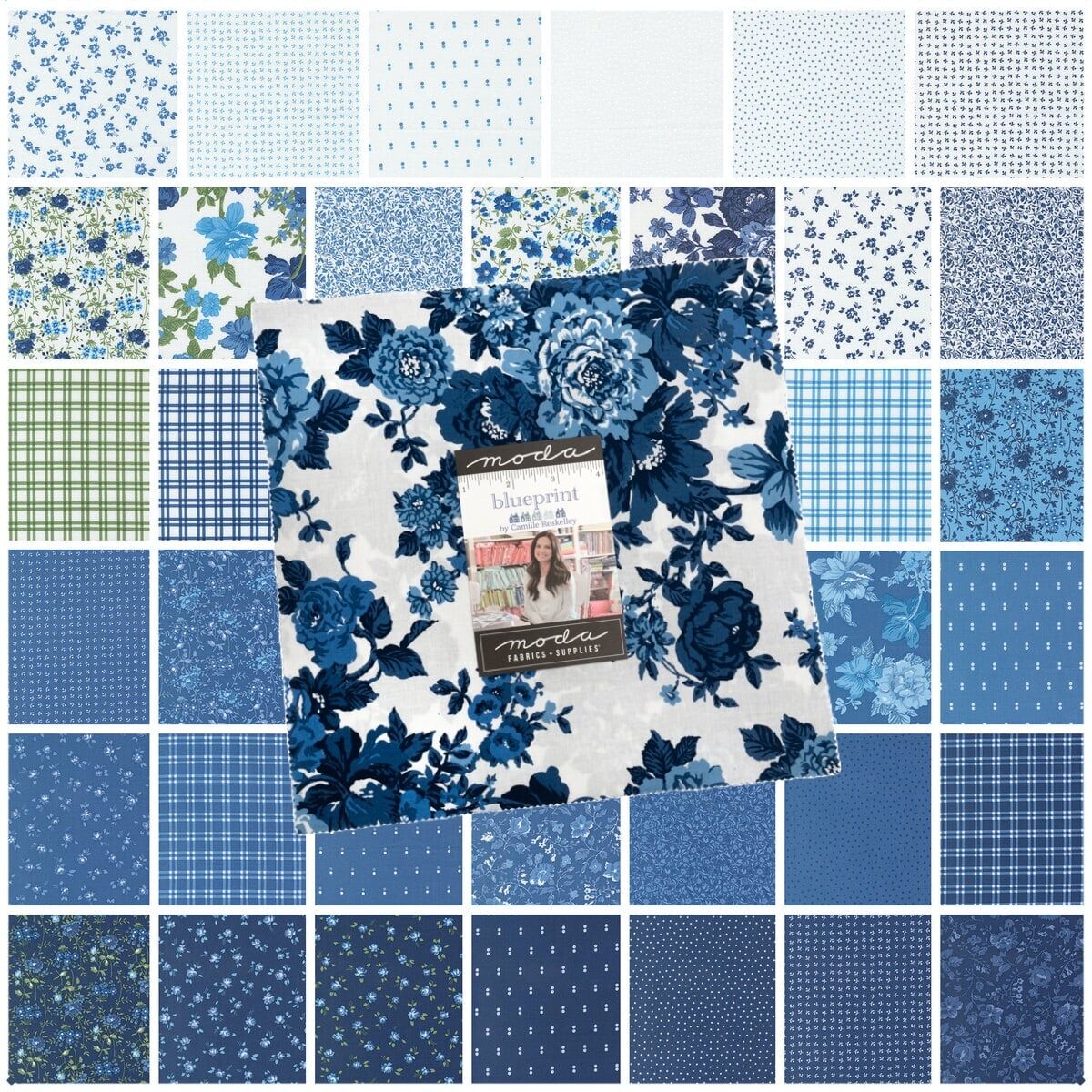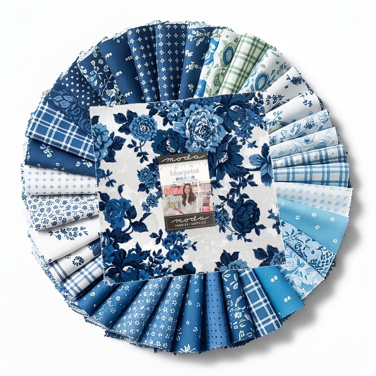 Moda "Blueprint" Layer Cake is a convenient pre-cut assortments of colour-coordinated fabric squares in 100% cotton for patchwork quilting. Designed by Designed by Camille Roskelley, and professionally cut and packaged by Moda Fabric, this pack contains 42 of 10" x 10" (or 25.4 cm x 25.4 cm) fabric squares - which are quite large and ideal to show off the design fully.