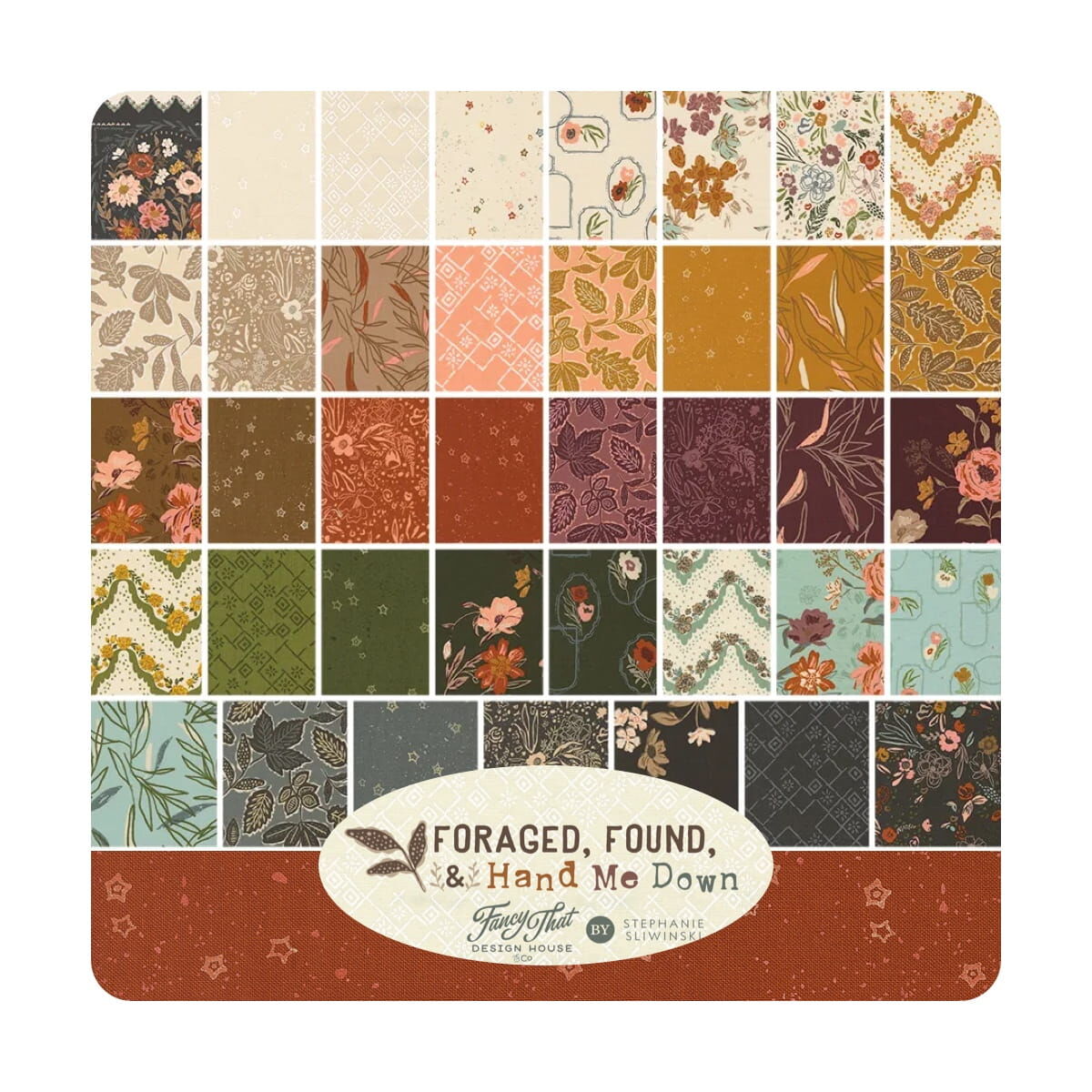 Moda "Foraged, Found & Hand Me Down" Charm Pack is a convenient pre-cut assortments of colour-coordinated fabric squares in 100% cotton for patchwork quilting. Designed by Fancy That Design House and professionally cut and packaged by Moda Fabric, this charm pack contains 42 of 5" x 5" (or 12.7 cm x 12.7 cm) fabric pieces - known as "Charm Squares".