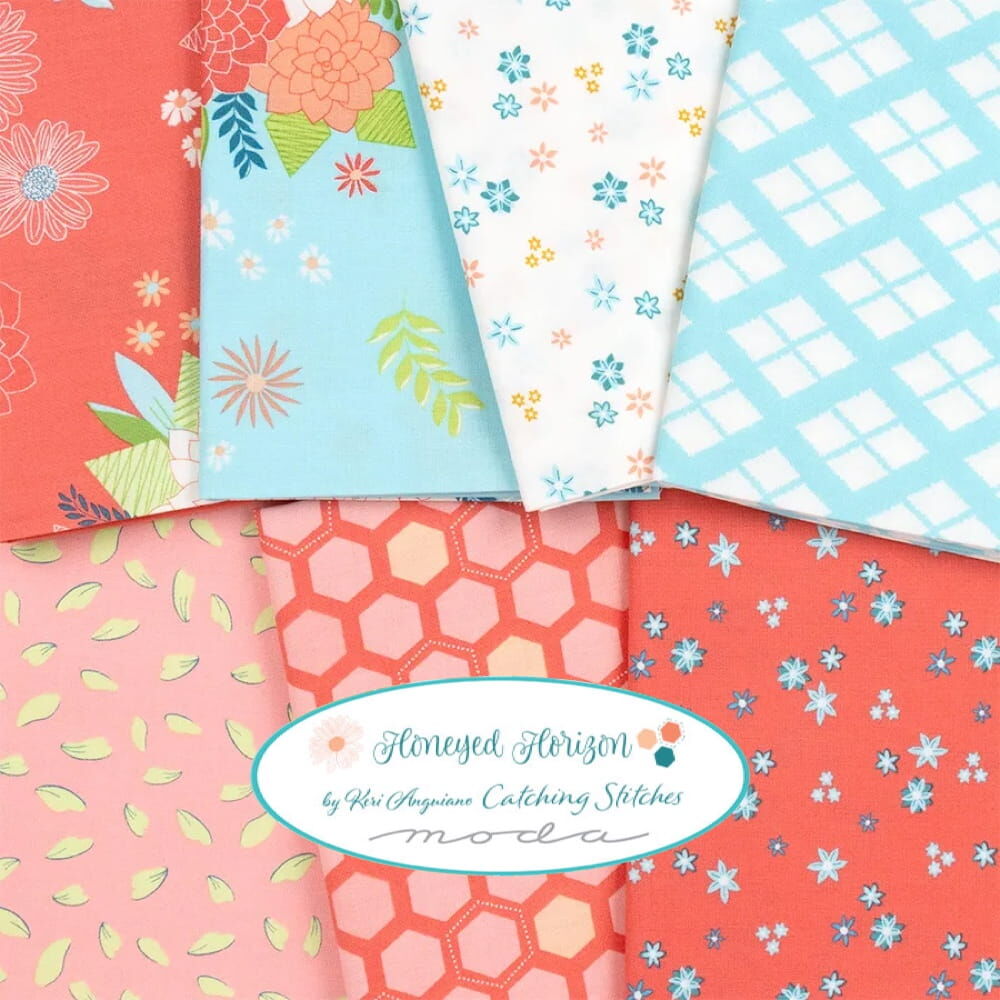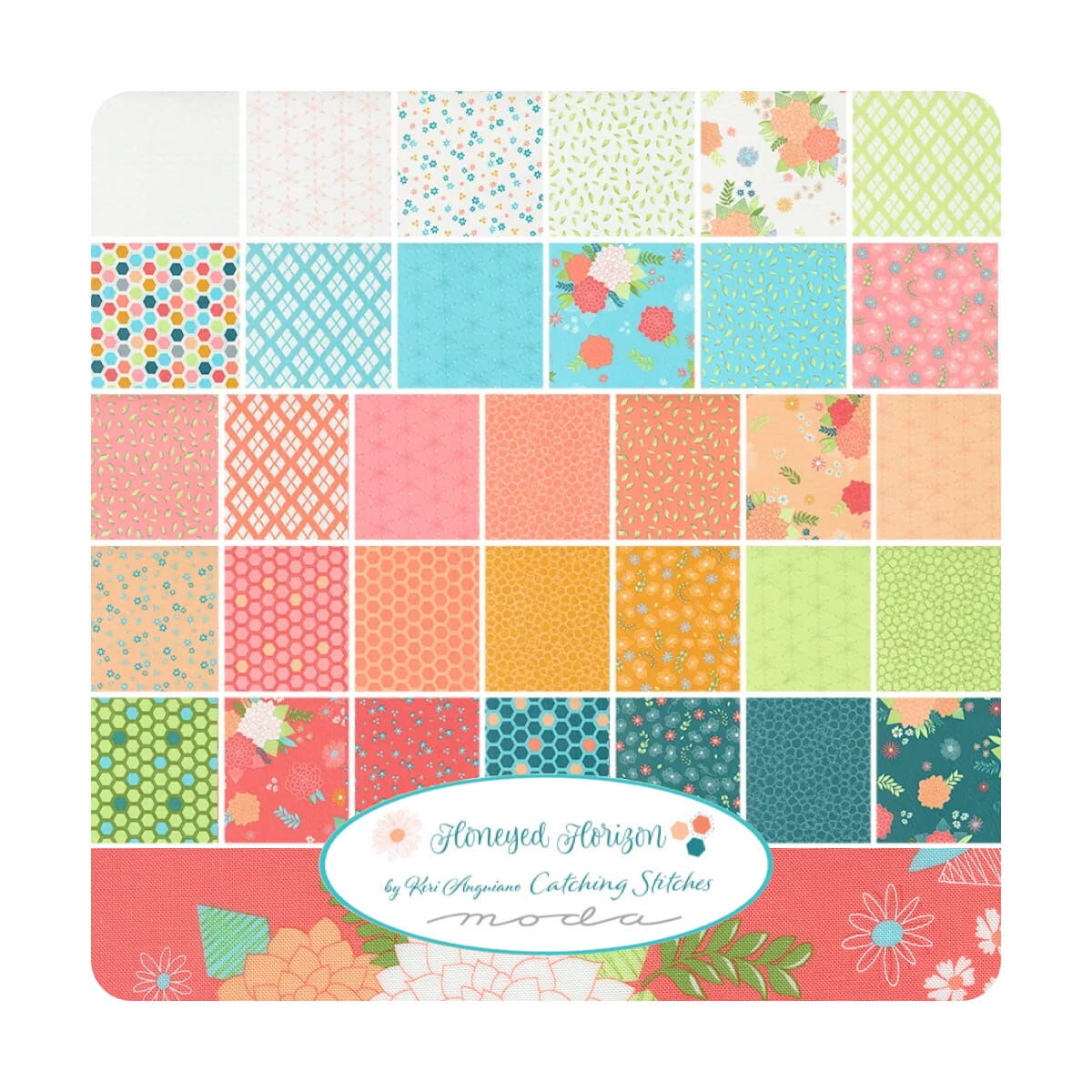 Moda "Honeyed Horizon" Charm Pack is a convenient pre-cut assortments of colour-coordinated fabric squares in 100% cotton for patchwork quilting. Designed by Keri Anguiano of Catching Stitches and professionally cut and packaged by Moda Fabric, this charm pack contains 42 of 5" x 5" (or 12.7 cm x 12.7 cm) fabric pieces - known as "Charm Squares".