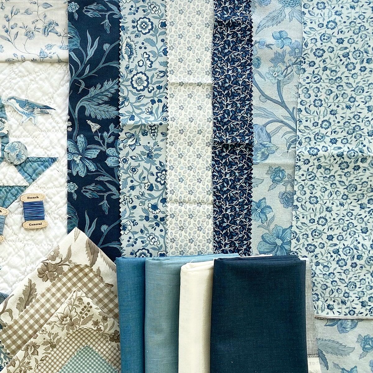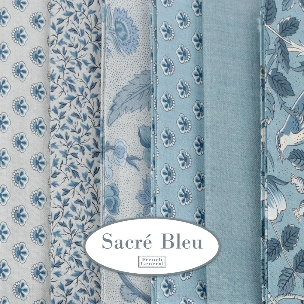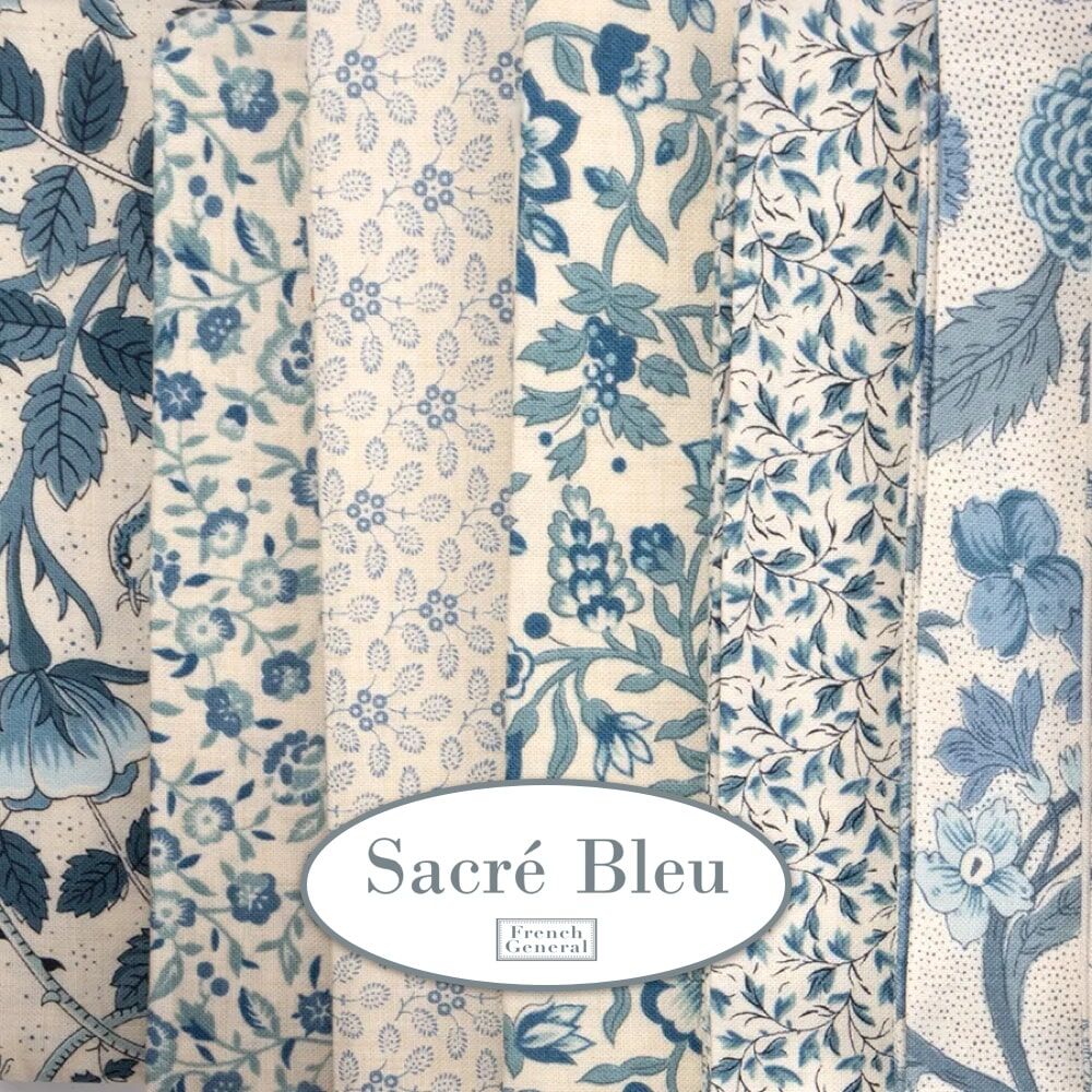 Inspired by summers in France, this collection features three of French General's favourite blues: French Blue, Woad Blue and Indigo, with a bit of Ciel Bleu woven in for a subtle play, plus some fresh French Ginghams to the mix and you have the perfect start to a French country quilt. Enjoy!