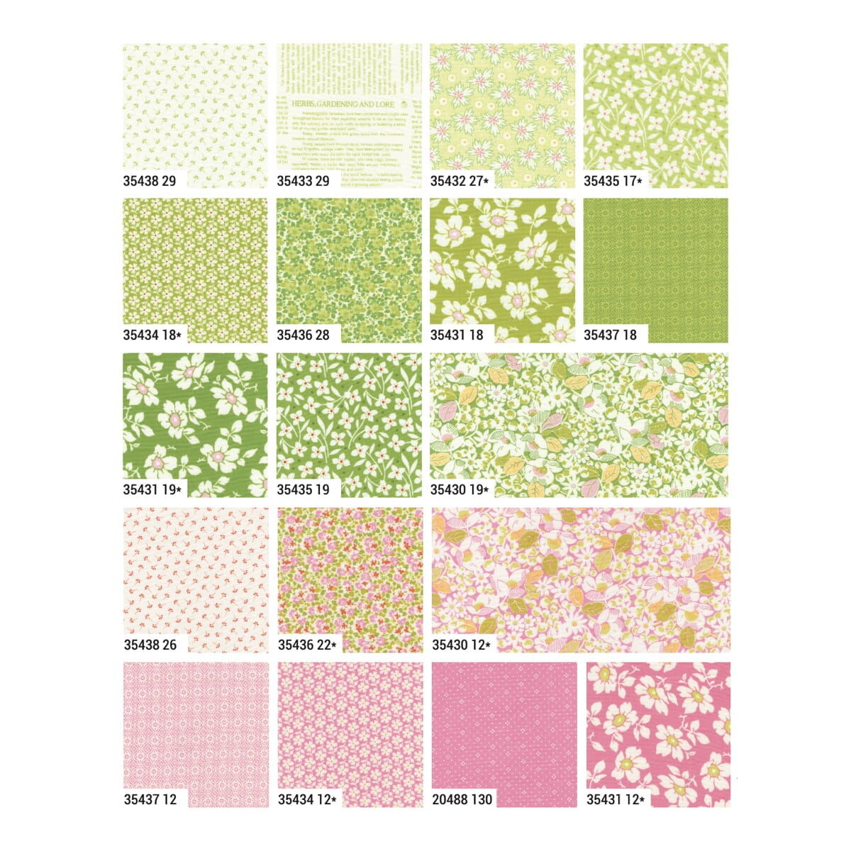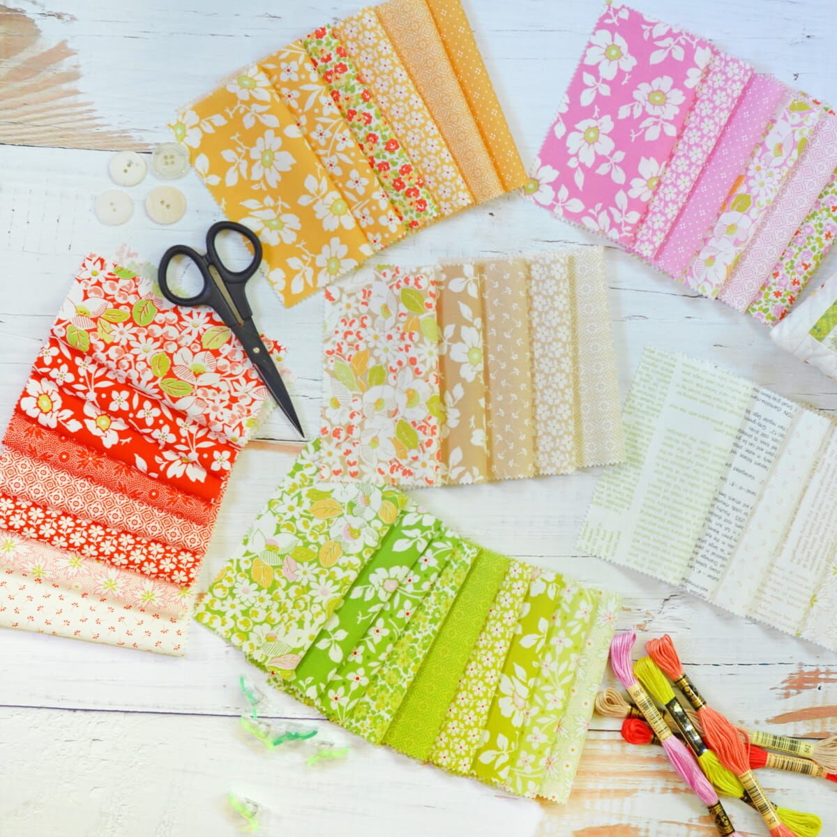 Moda "Summer's End" Charm Pack is a convenient pre-cut assortments of colour-coordinated fabric squares in 100% cotton for patchwork quilting. Designed by Fig Tree & Co and professionally cut and packaged by Moda Fabric, this charm pack contains 42 of 5" x 5" (or 12.7 cm x 12.7 cm) fabric pieces - known as "Charm Squares".