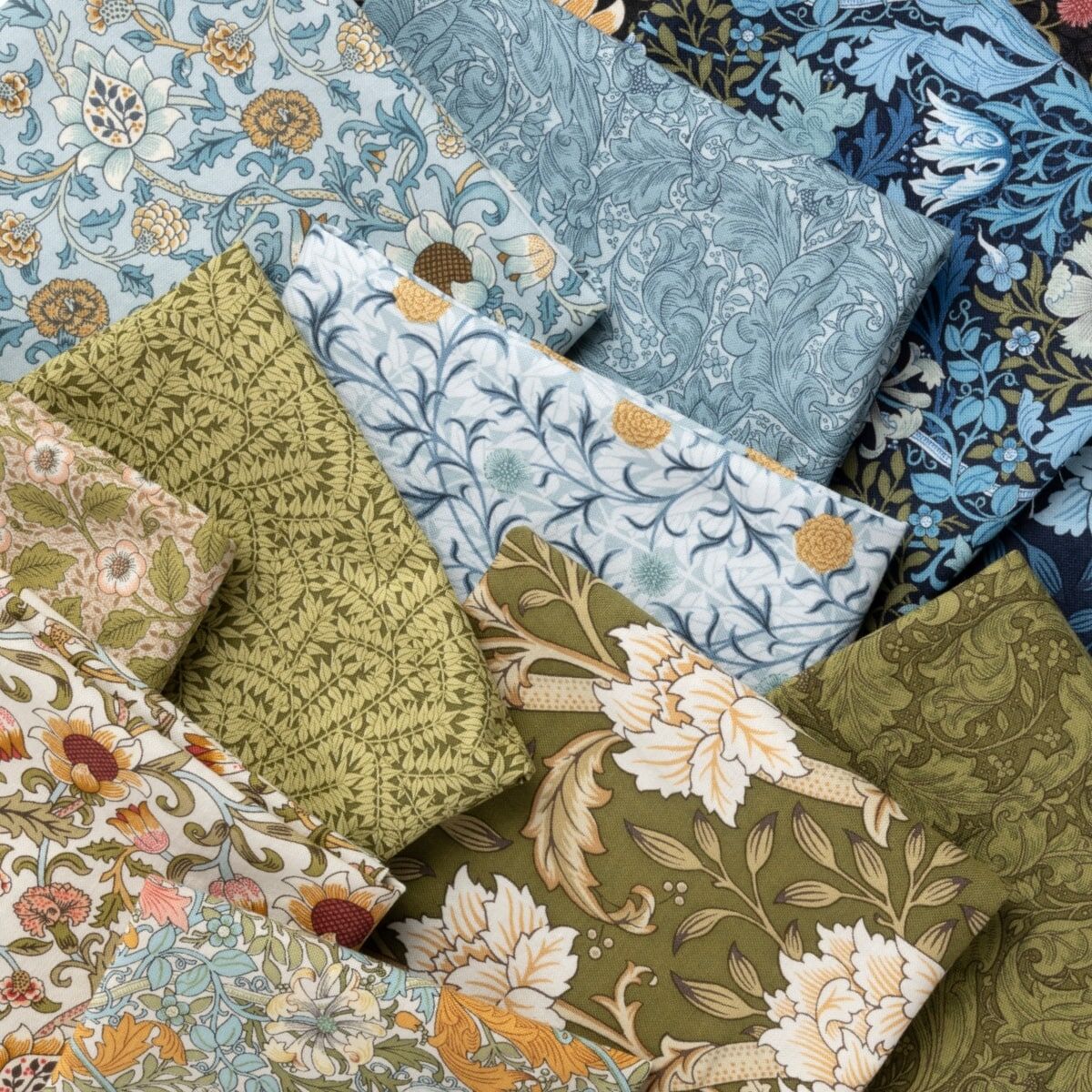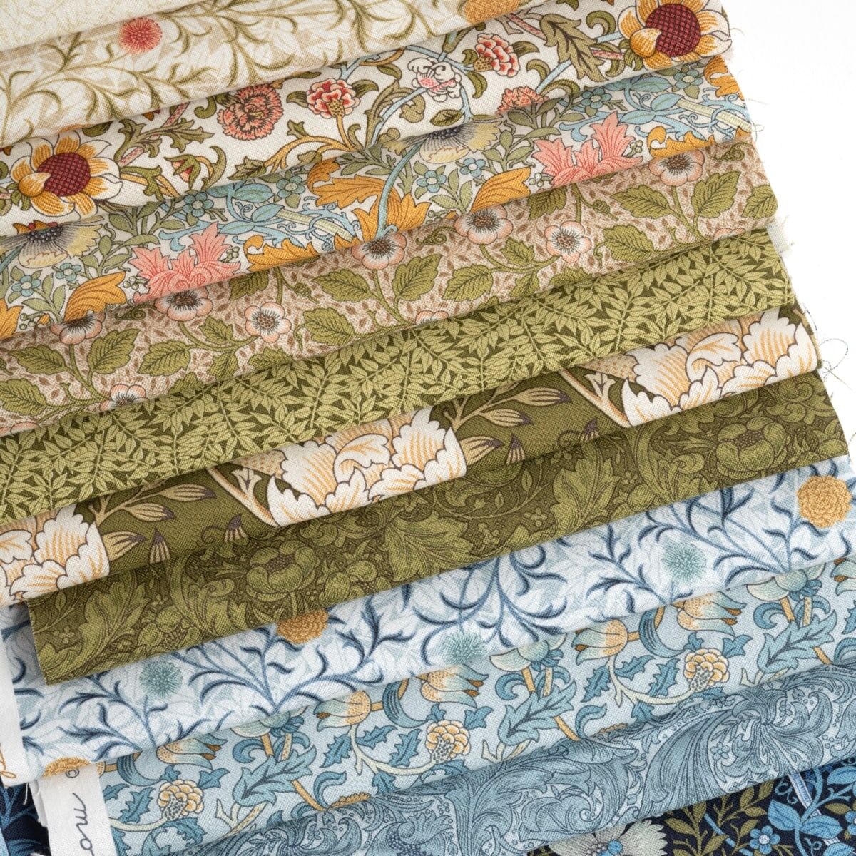Moda "Morris Manor by Barbara Brackman" Charm Pack is a convenient pre-cut assortments of colour-coordinated fabric squares in 100% cotton. Reproduction fabric designed by William Morris, and professionally cut and packaged by Moda Fabric, this charm pack contains 42 of 5" x 5" (or 12.7 cm x 12.7 cm) fabric pieces - known as "Charm Squares". Inspired by the Morris summer home Kelmscott Manor, this collection is filled with river-inspired shades of blue and green botanical prints - featuring rare gems such as the leafy Branch and the Scroll floral William Morris created from an earlier period. You can instantly create timeless elegance of the Arts & Crafts era effortlessly. Enjoy!