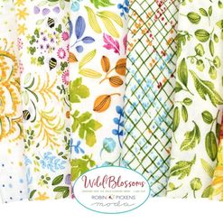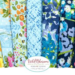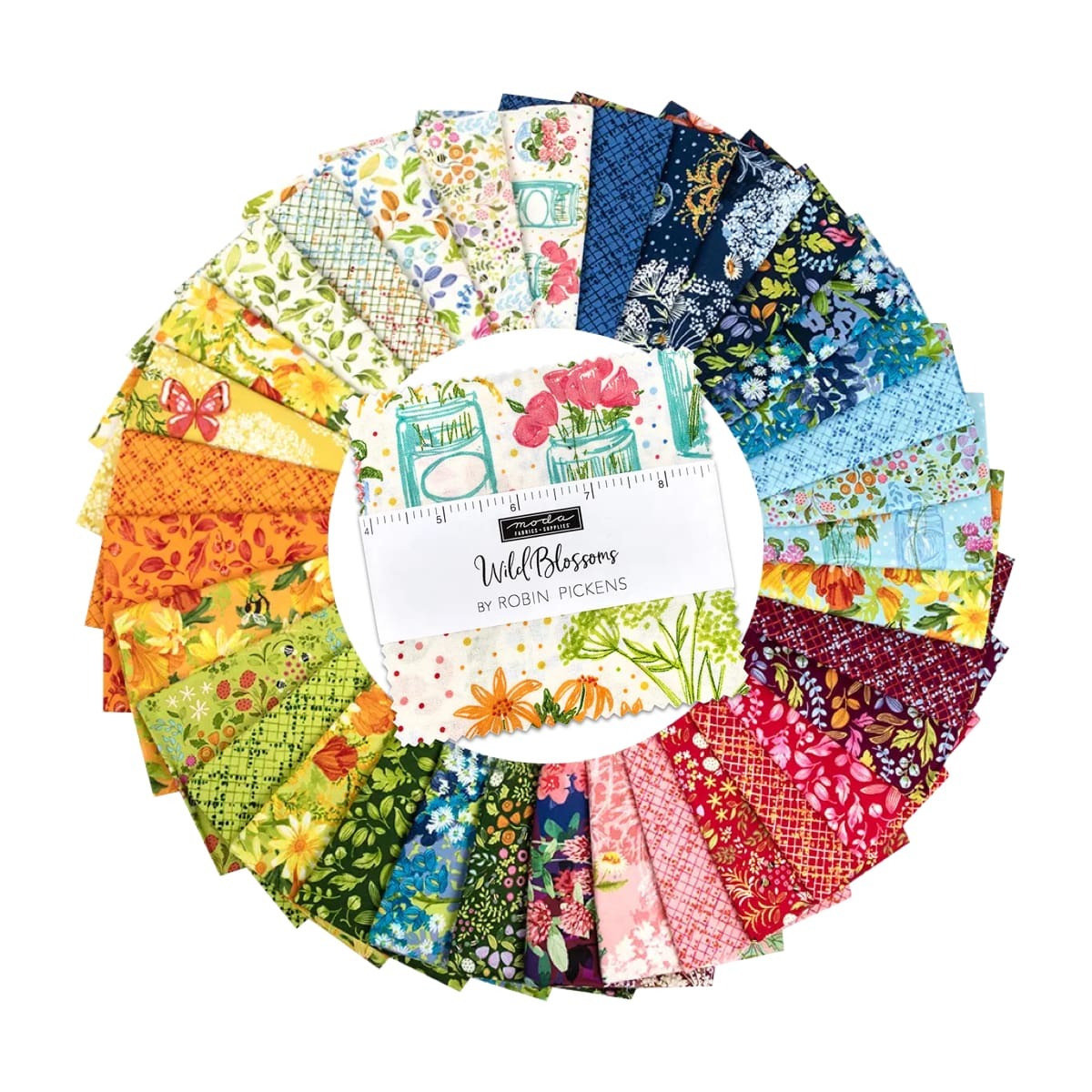 Moda "Wild Blossoms" Charm Pack is a convenient pre-cut assortments of colour-coordinated fabric squares in 100% cotton for patchwork quilting. Designed by Robin Pickens, and professionally cut and packaged by Moda Fabric, this charm pack contains 42 of 5" x 5" (or 12.7 cm x 12.7 cm) fabric pieces - known as "Charm Squares". Wild Blossoms is a gorgeous selection of fabrics in Robin Pickens' signature hand-painted style. Enjoy fabulous floral and geometric patterns, all paired with charming Wild Blossoms in colours that range from Thatched Cream, Early Dawn (pink), Berry, Scarlet, Apricot, Buttercup, Chartreuse, Grass, Mist (light blue) and Navy. Take a stroll through a thriving field of flourishing florals with this collection!