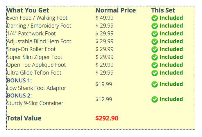 As a Special Package Deal, Your Denim & Dressmaking Feet Pack* includes: