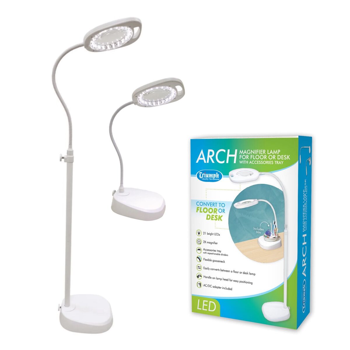 Triumph Arch LED Magnifier Lamp - 2-in-1 Floor & Desk Light with Tray