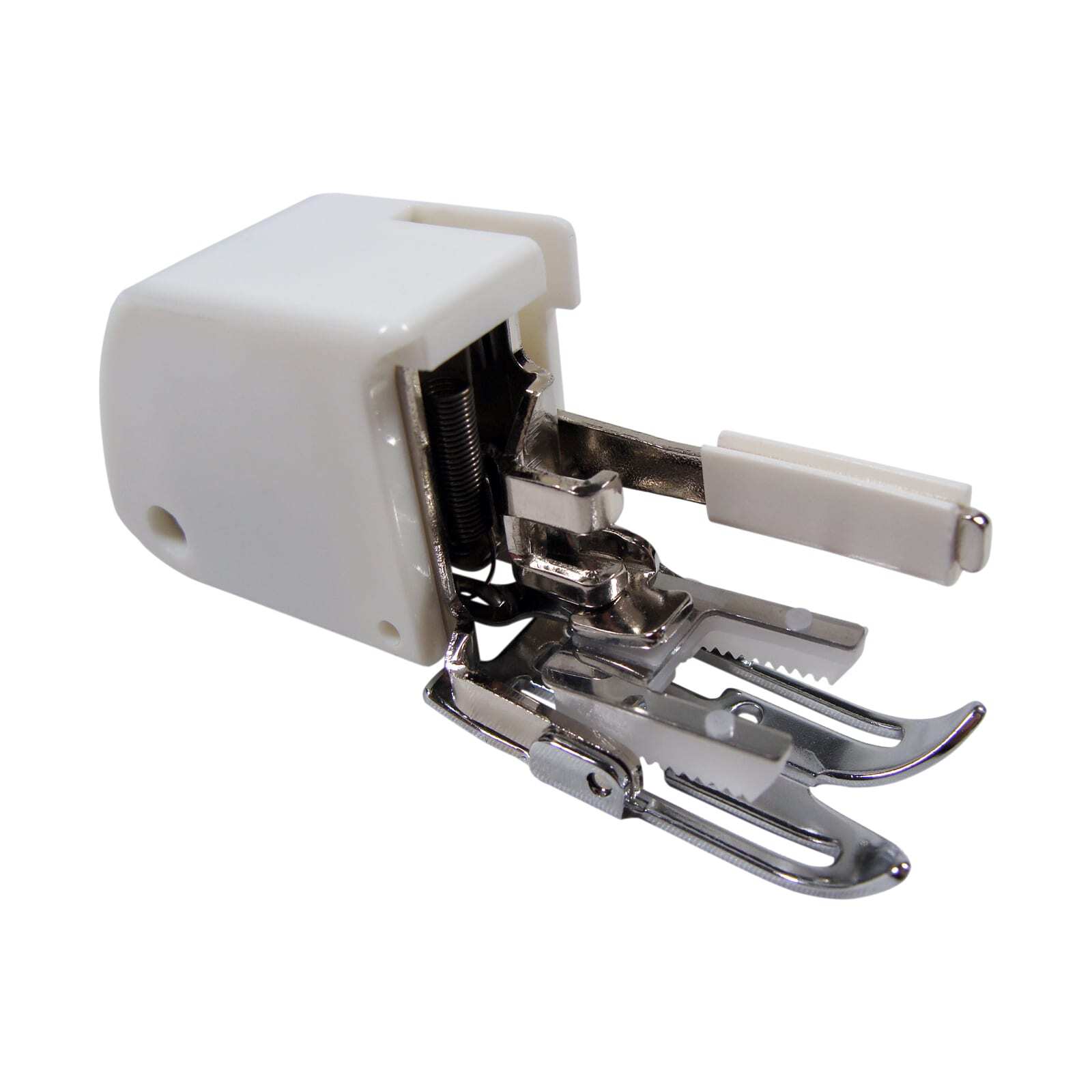 Housed in a durable Grade A plastic casing, this Walking Foot has ALL metal internals for durability , and light weight plastic 'teeth' gentle enough to protect your most delicate fabrics!