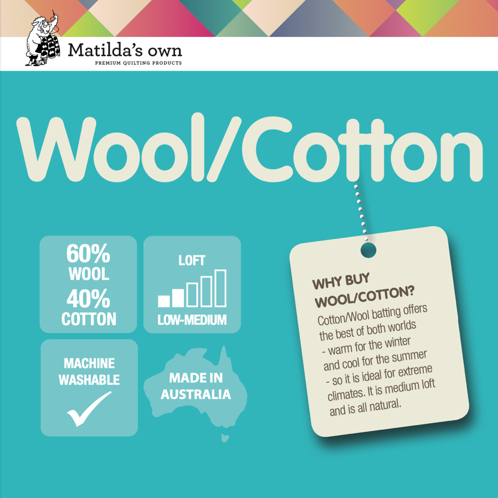 Matilda's Own Wool / Cotton (sometimes know as Cotton / Wool) batting was created based on demand from Australia's quilters.